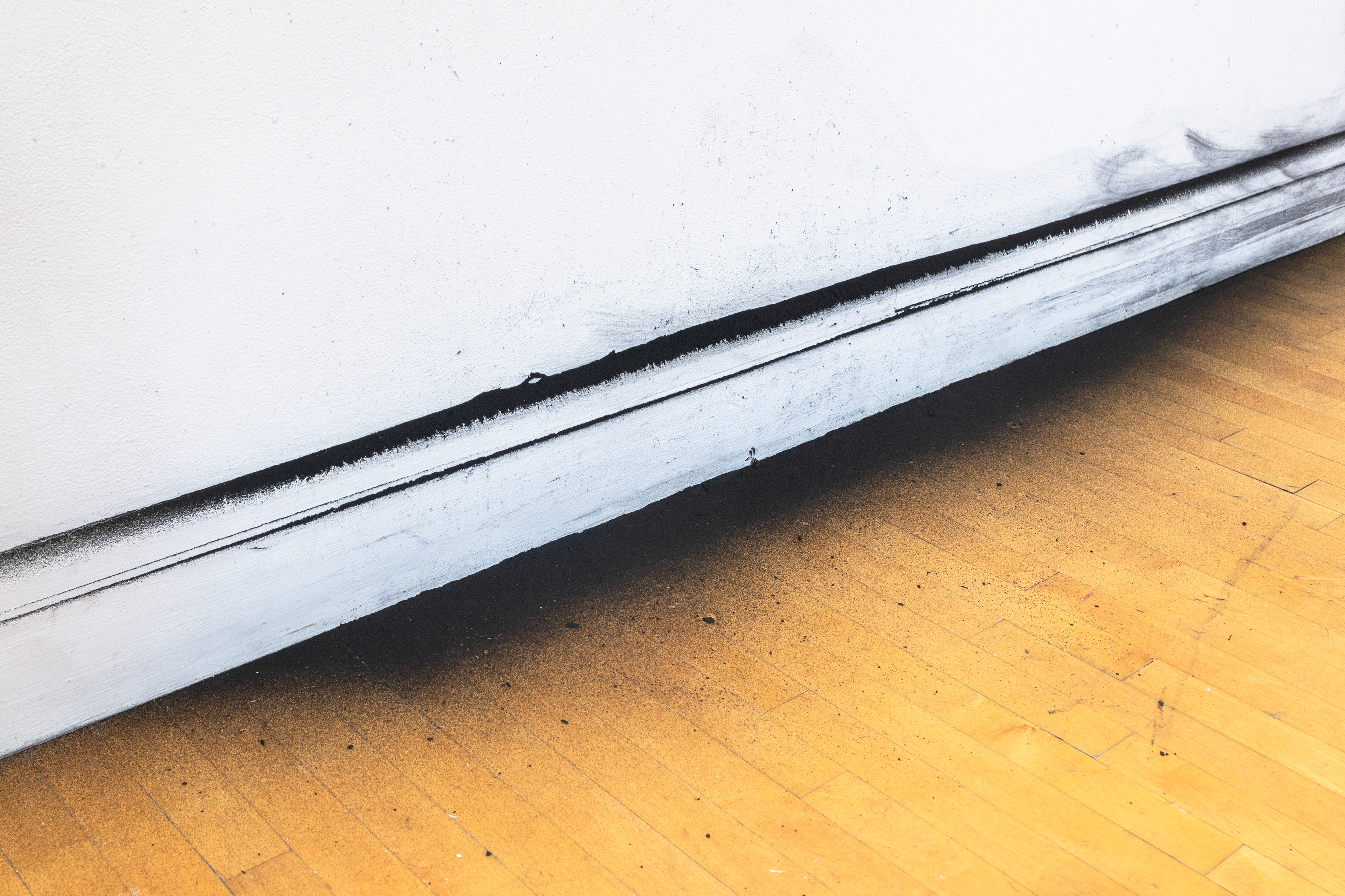right: Dimension Reduction of Black Charcoal Cuboid, 2020, charcoal