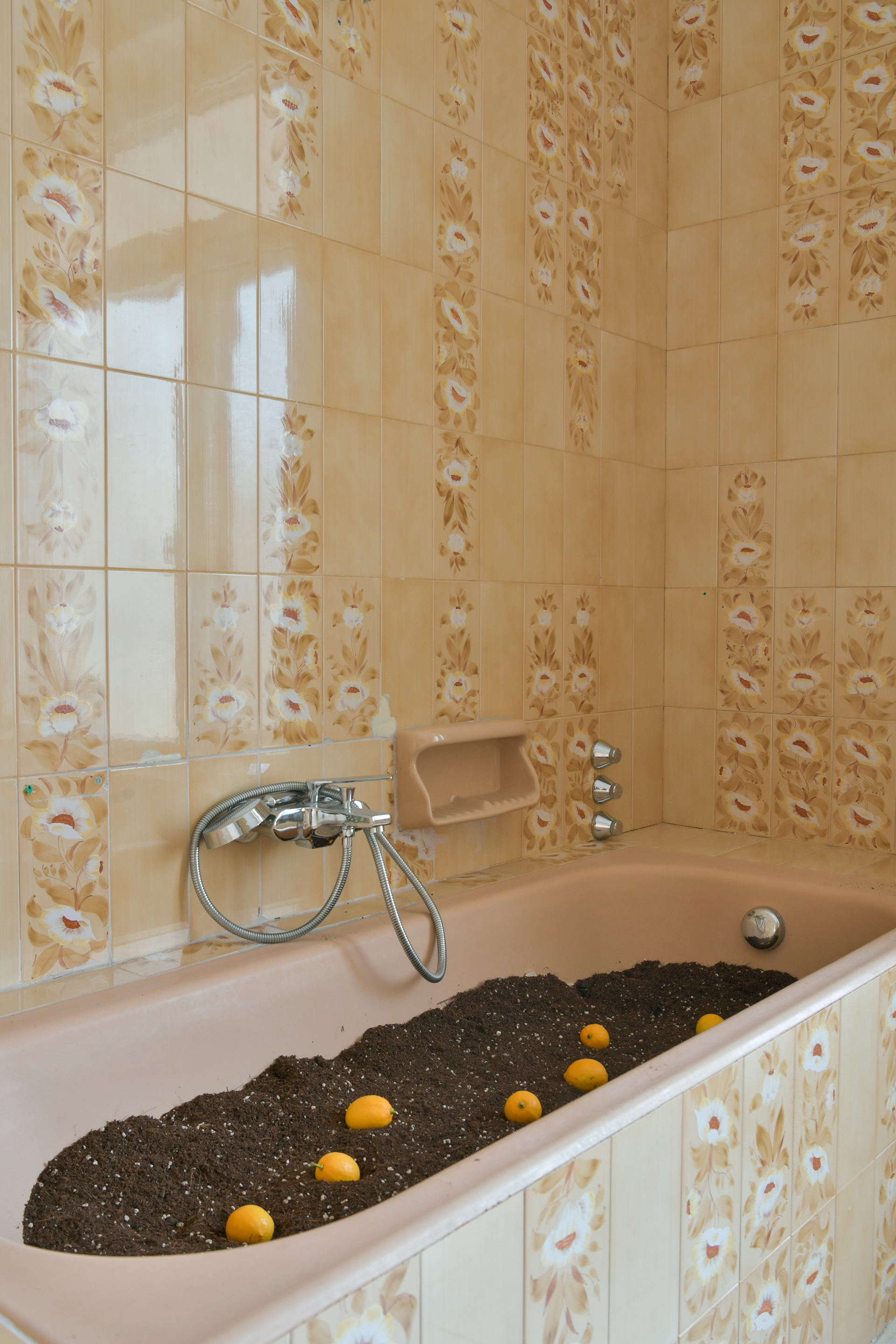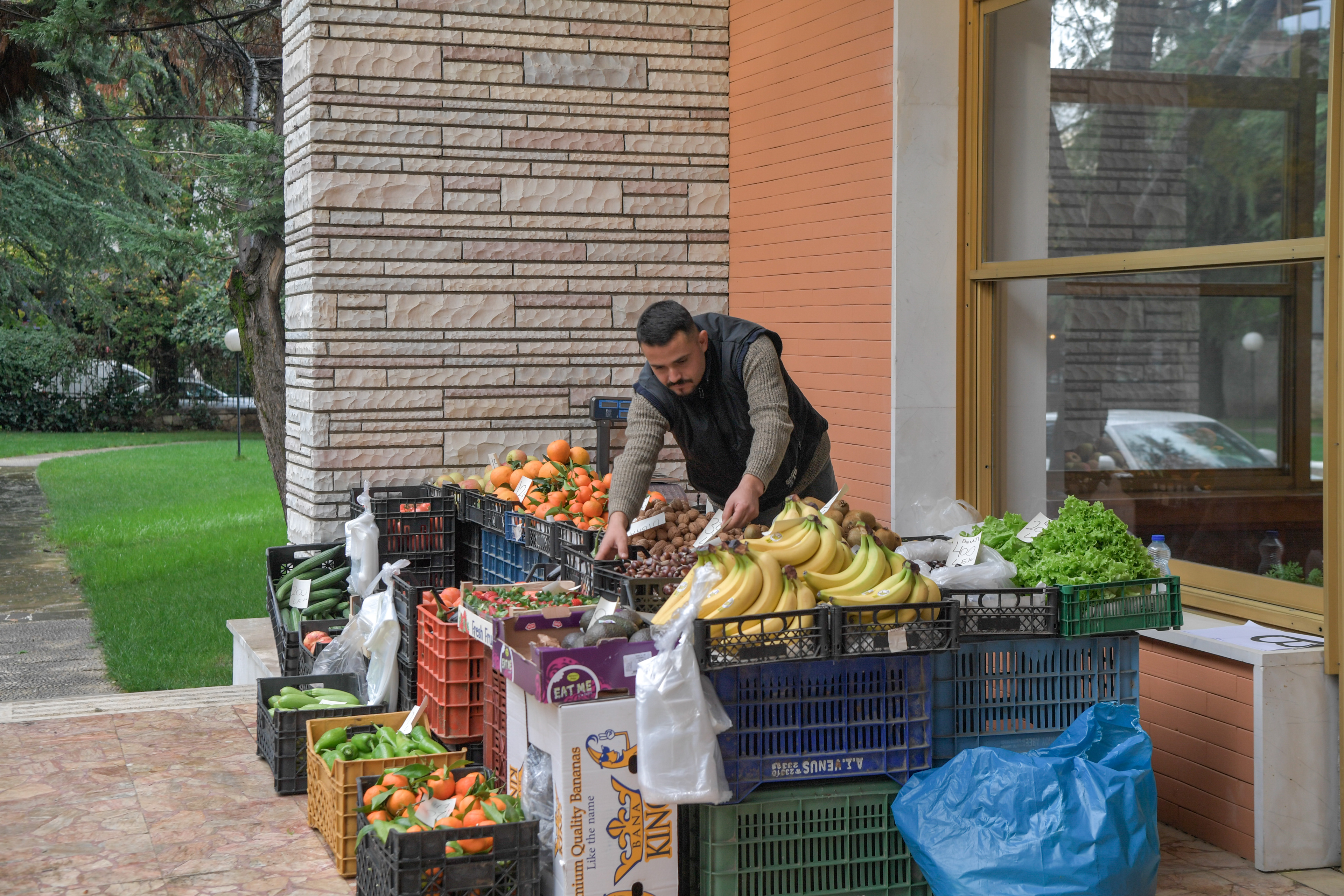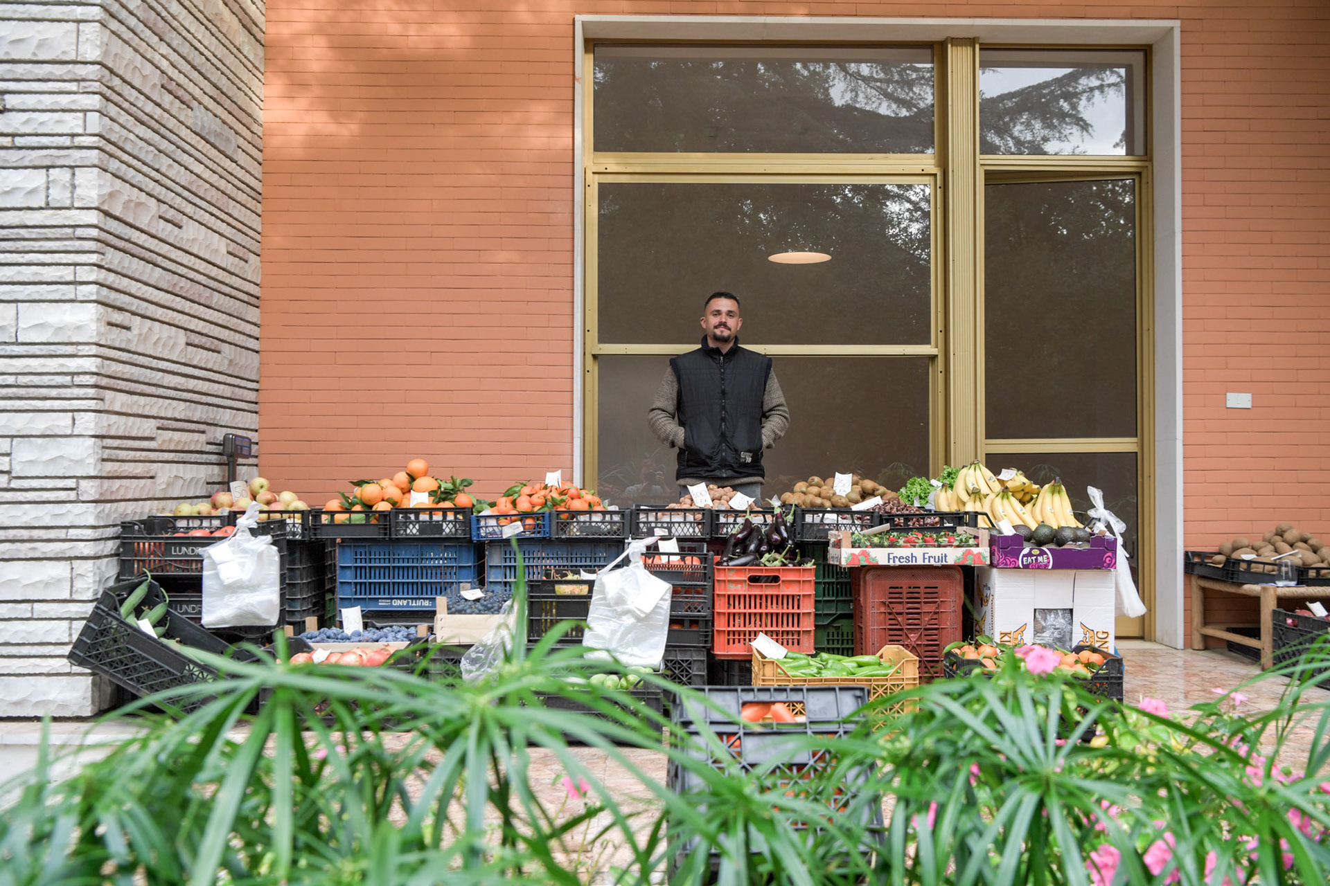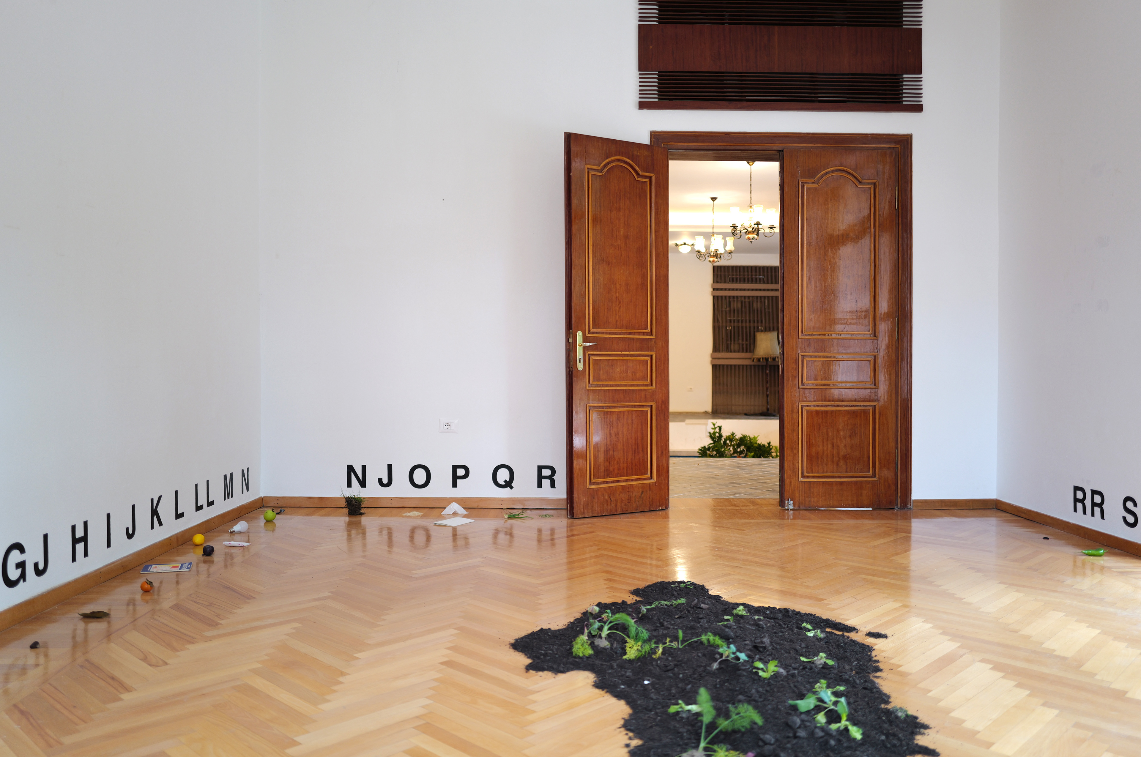 Outside this room, a Tirana's local merchant is invited to sell fruits and vegetables. What they offer, oranges, lemons, and other produce, whose meaning is defined by the surrounding installations. Visitors are encouraged to purchase according to their needs or their wish to take home a piece of art.