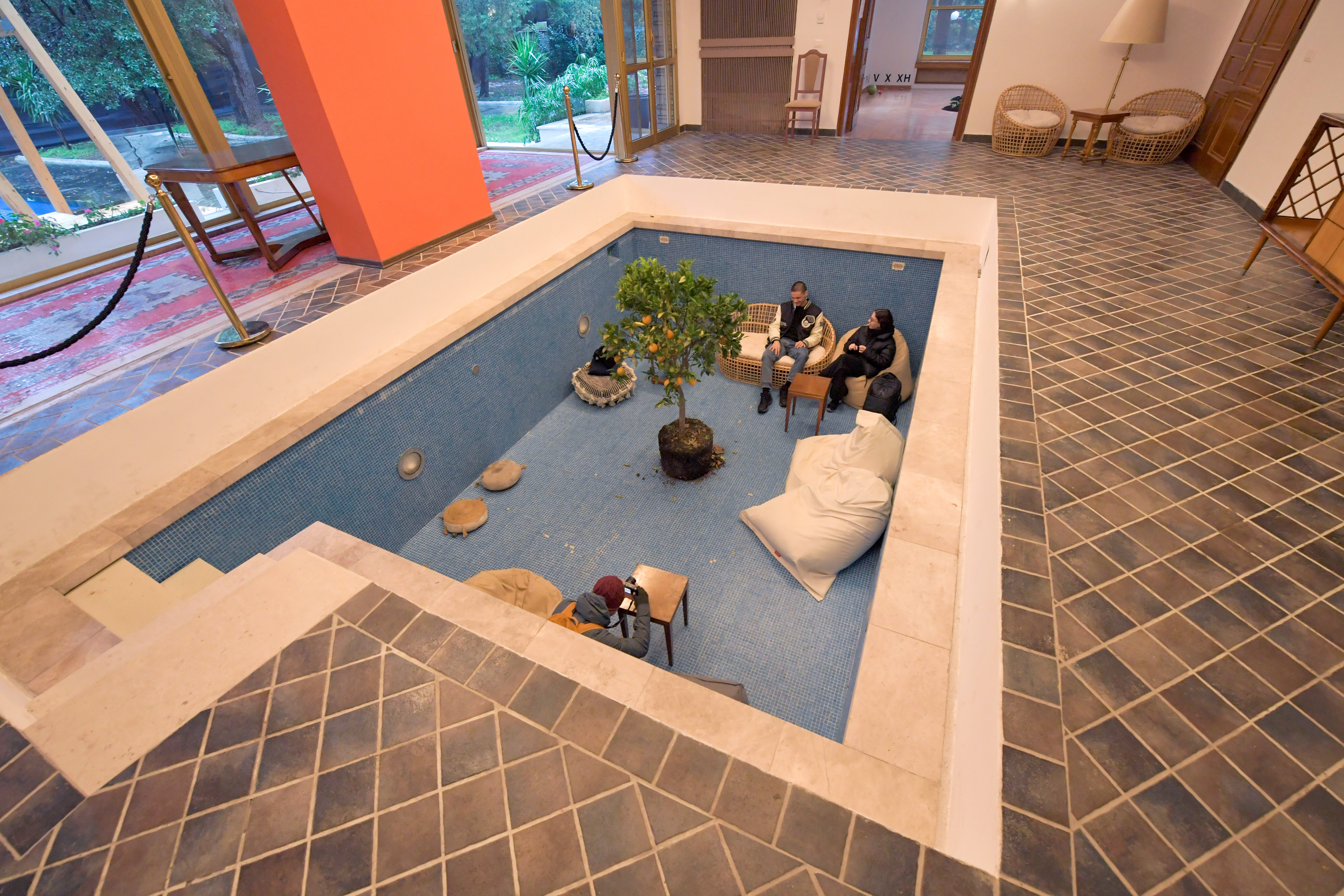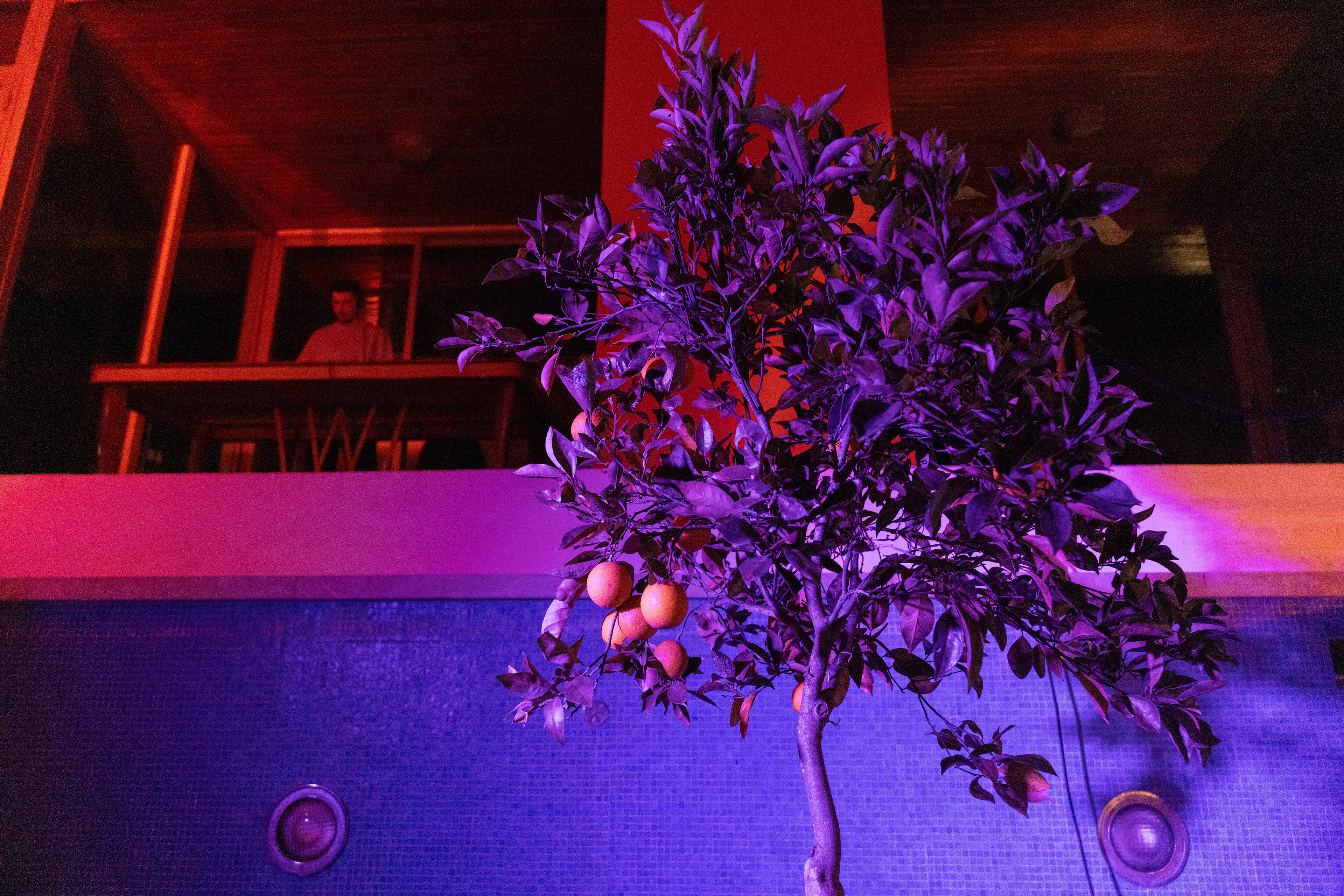 One orange tree is planted in the garden, and the other one is placed in the swimming pool, which turns it into a social space.