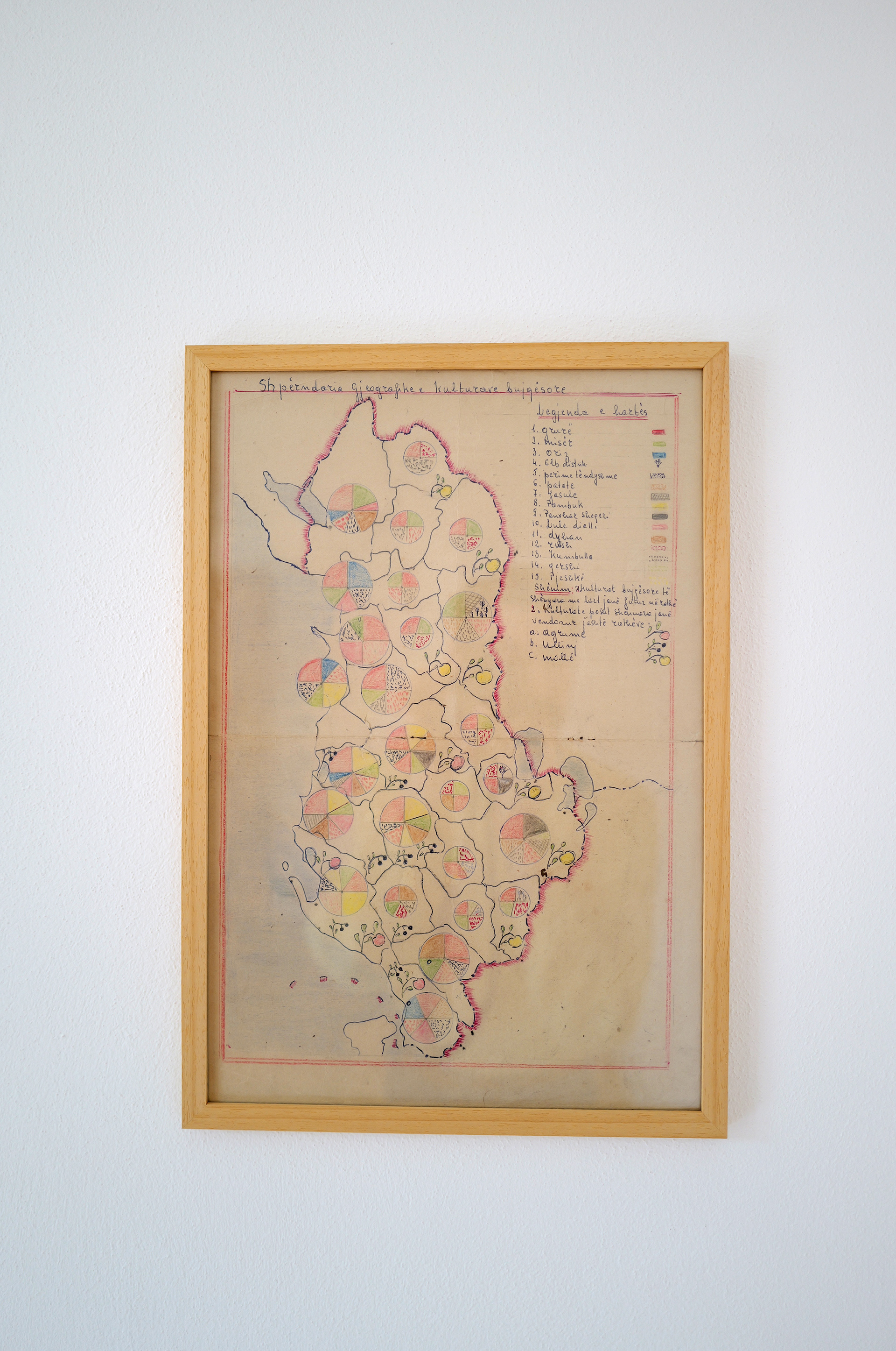 The artist found a hand-drawn map titled Map of the Distribution of Agricultural Crops in Albania and decided to investigate more about this map and figure out who made it and why. She went to Prof. Edvin Zhllima from Agricultural University of Tirana. During their conversation, she learned that this is likely a map of 26 districts made by a 12th-grade high school student during the communist regime, as part of a school assignment, possibly for a geolography class. It is missing the numbers and only includes pie charts. The use of lines suggests that the student was copying a map from the Statistical Yearbook of Agriculture between the 1960s and 1980s. This student was probably in their final year of high school, according to Prof. Edvin Zhllima, because that was when teachers started allowing students to write in inconsistent letters, due to the heavy school workload.
