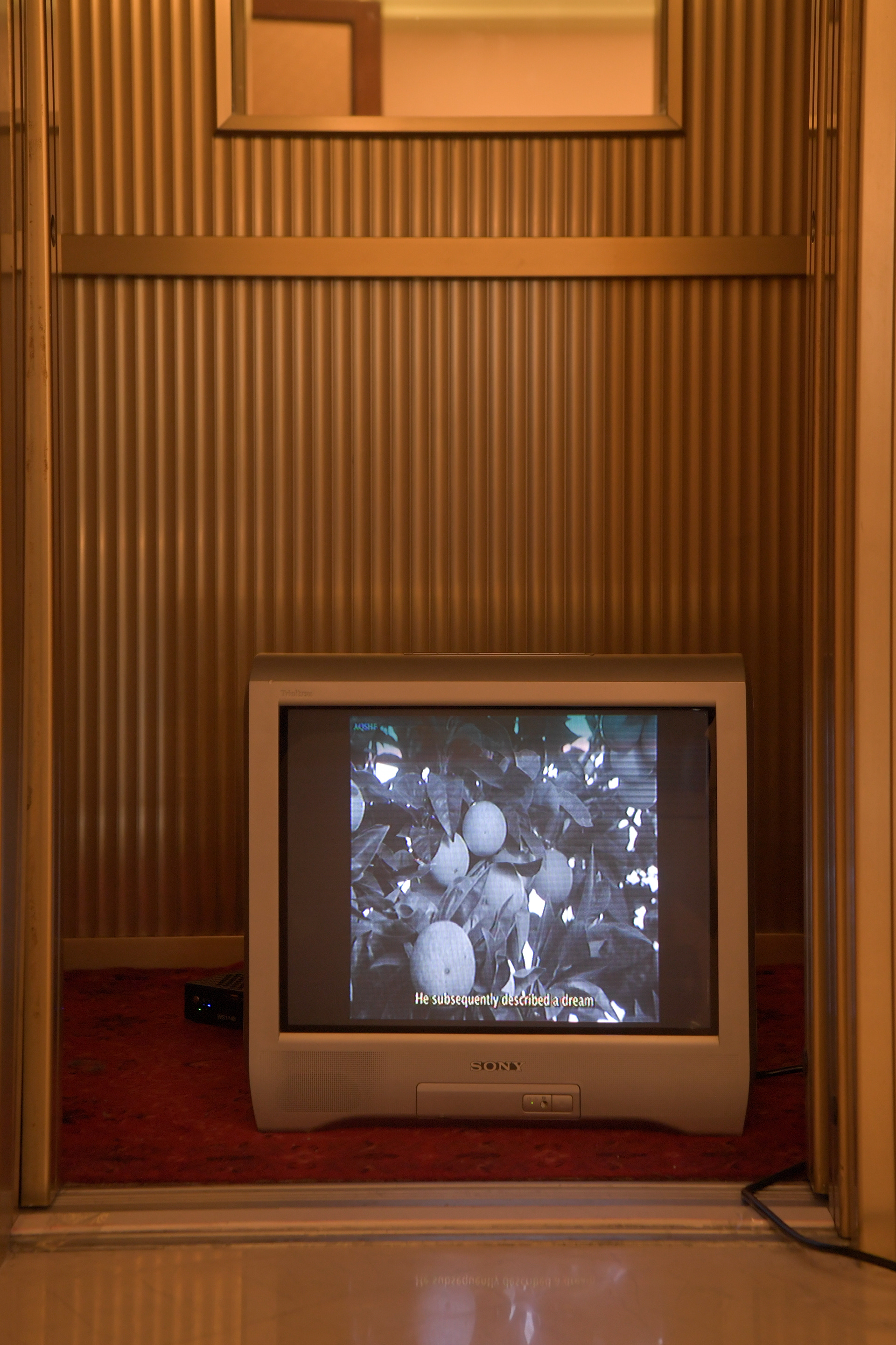 The 2.5 min short film shown on the television placed inside the dictator’s elevator is reconfigured from propaganda footage produced during Albania’s communist regime. It follows a group of scientists who have leased a lemon orchard to conduct a series of secret experiments.