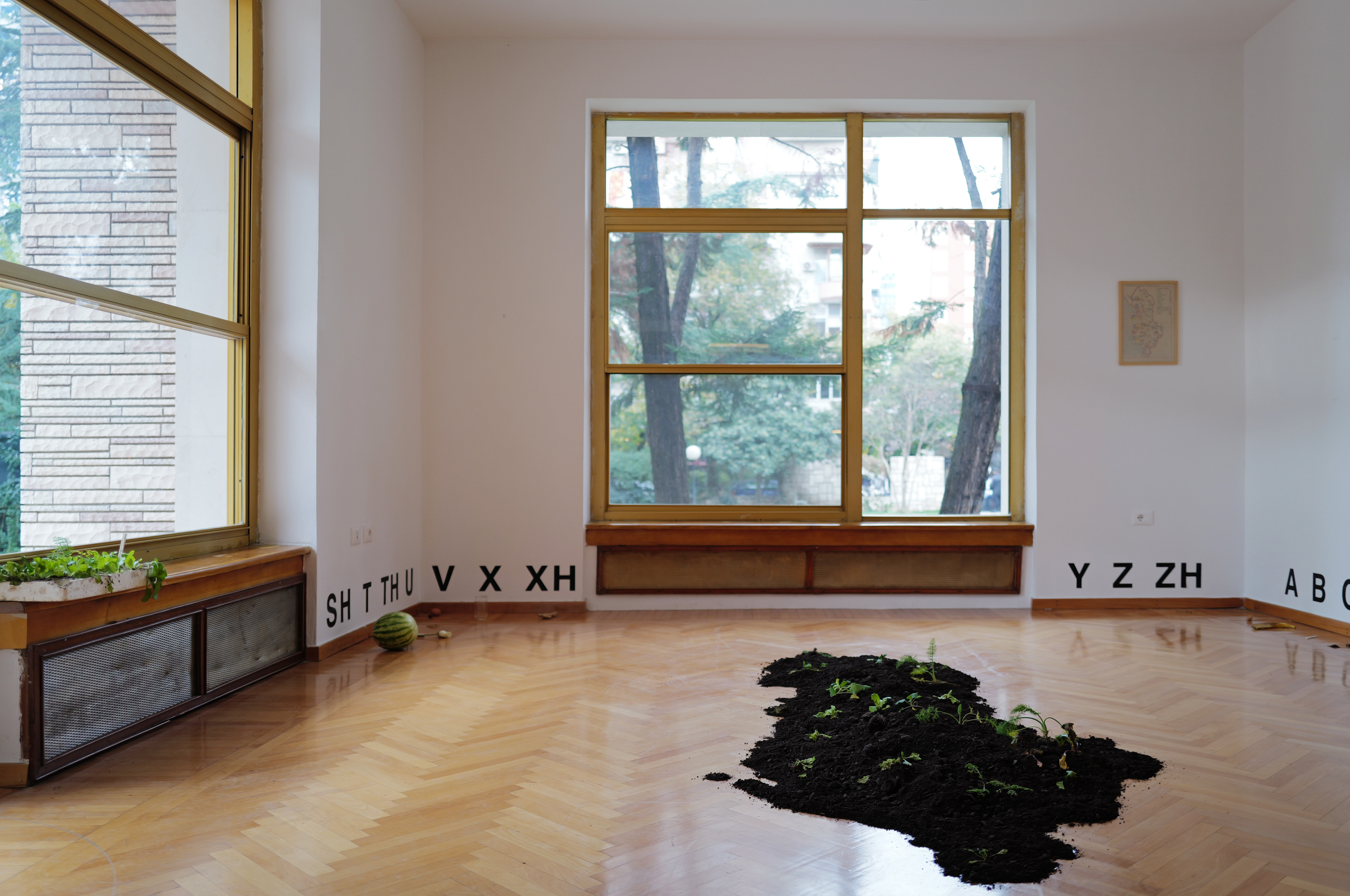 Using the data of the map as a guide, the artist invites participate collectively distributes the crops in the central installation, arranged in the shape of Albanian territory. The audience is invited to imagine a future in which a possible field of sunflowers sterms. In doing so, they collectively carry forward the meaning of an assignment that may have started by a 12th-grade student.